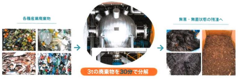 また、独自の丸型構造を採用することで、装置内での加熱・加圧が均等になり、効率的な処理が実現。処理後は無菌・無害化された状態で排出されるため、衛生面でも安心です。金属・石・ガラスなどの無機物はそのまま排出されるため、事前分別が推奨されます。